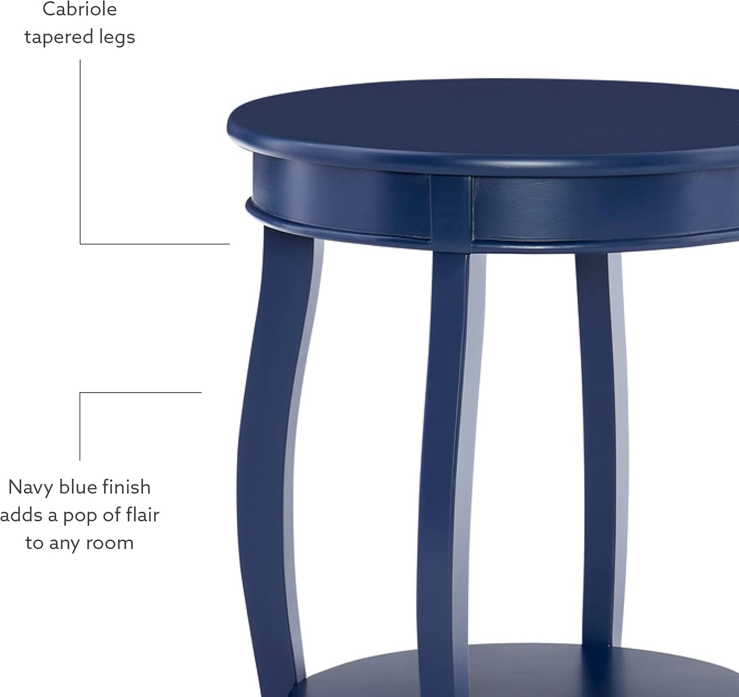 This contemporary round side table is a functional accent piece suitable for any room of your home. Pair this piece with your favorite lounge chair, on either side of your sofa or even as a nightstand beside your bed. Offering extra storage, two round shelves provide a convenient option for displaying flowers, magazines or your beloved family photos. The navy blue finish and cabriole tapered legs add a pop of flair to your home design.