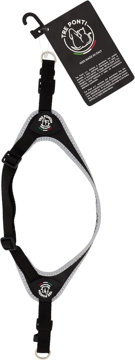 Tre Ponti harnesses are all designed from the idea to give the dog the best possible freedom of movement. Tre Ponti harnesses never touch negative pressure points on the dogs. Tre Ponti has chosen not to develop one type of harness for all the diifferent sizes of dogs that would needed to be adjusted for different sizes or types of dogs. No, it is a deliberat choise to design different models for different sized dogs, because they have specific needs. This creates the optimum gear for any size dog. The Tre Pomti Fibbia Harness is idel for both for very small and small dogs. It has a reflective trim that provides exceptional visibility in the dark. The excellent fit and thoughtful design of the Tre Ponti harnesses gives maximum movement and freedom to the dog. The ergonomic design and the fit are adapted to the size of the dog. Harness Sizes 1 - up to 3 kg 1.5 - up to 4 kg 2 - up to 5 kg 2.5 - up to 6 kg 3 - up to 7 kg This harness is not an anti-pull harness, it is is a 'tool' to help you break the pulling habit. When the leash is pulled, the movement freedom disappears and will provoke a reaction in the dog.Typically, your dog immediately stops and will look back to see what is going on. By rewarding this reaction you encourage the dog not to pull the leash and puppies can learn this at an early stage.